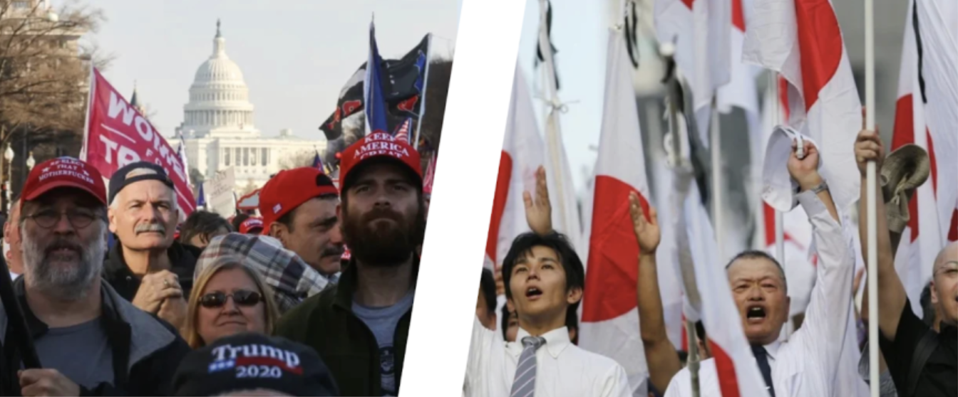 Although, like in the U.S., dissent exists in Japan, the societal uniformity that puts pressure on homogeneity allows for a kind of nationalism that resurrects imperial pride. In turn, unifying the people against an external threat. On the other hand, nationalism within the U.S. has led to further polarization that pins Americans against each other, leading to political idealists (namely, right-wing politicians) using extreme means, often resorting to political violence, to save America or “make it great again.” In other words, Japanese nationalists lead with othering an external threat to the nation, while American nationalists point to an internal threat.