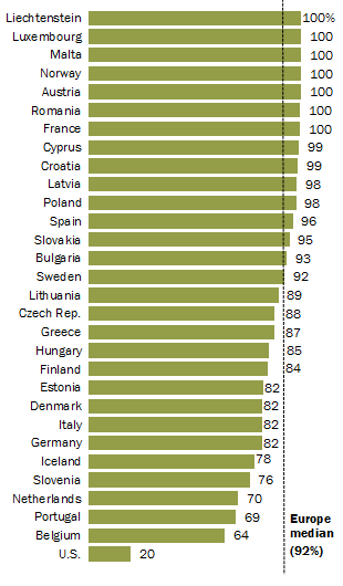 Europe drastically outpaces US in foreign language learning. Image via Pew Research Center